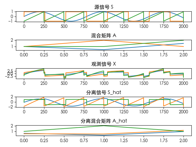 \hat{\mathbf{S}} = \hat{A}^{-1} \mathbf{X}其可基于 Python 中的 sklearn.decompsition 中的 FastICA 方法快速实现: