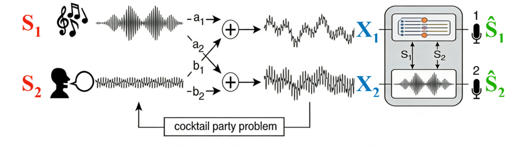 独立成分分析(Independent Component Analysis, ICA)是一种统计信号处理方法,其目标是从多个观测到的混合信号中分离出统计上相互独立的潜在源信号。常用的例子是“鸡尾酒会问题”:在一个房间内有两个独立的声音源(源信号 S1、S2),而麦克风记录到的是两条混合后的音频(观测信号 X1 和 X2)。ICA 方法通过这些混合信号估计出独立的信号(Ŝ1 和 Ŝ2),从而实现对音源的分离。