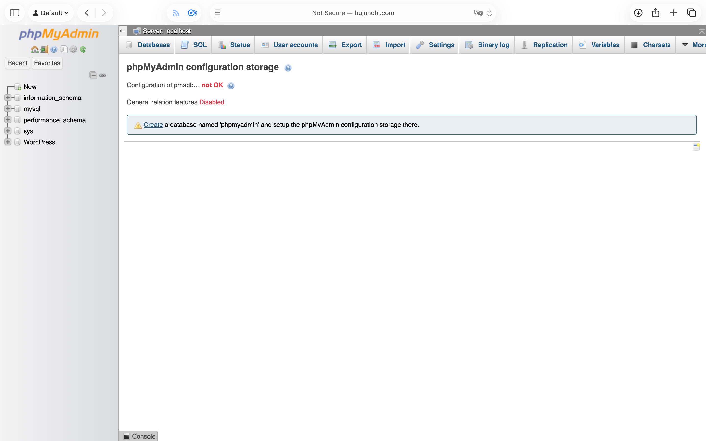 直接点击 Create 创建,新增 phpMyAdmin 数据库后即可解决: