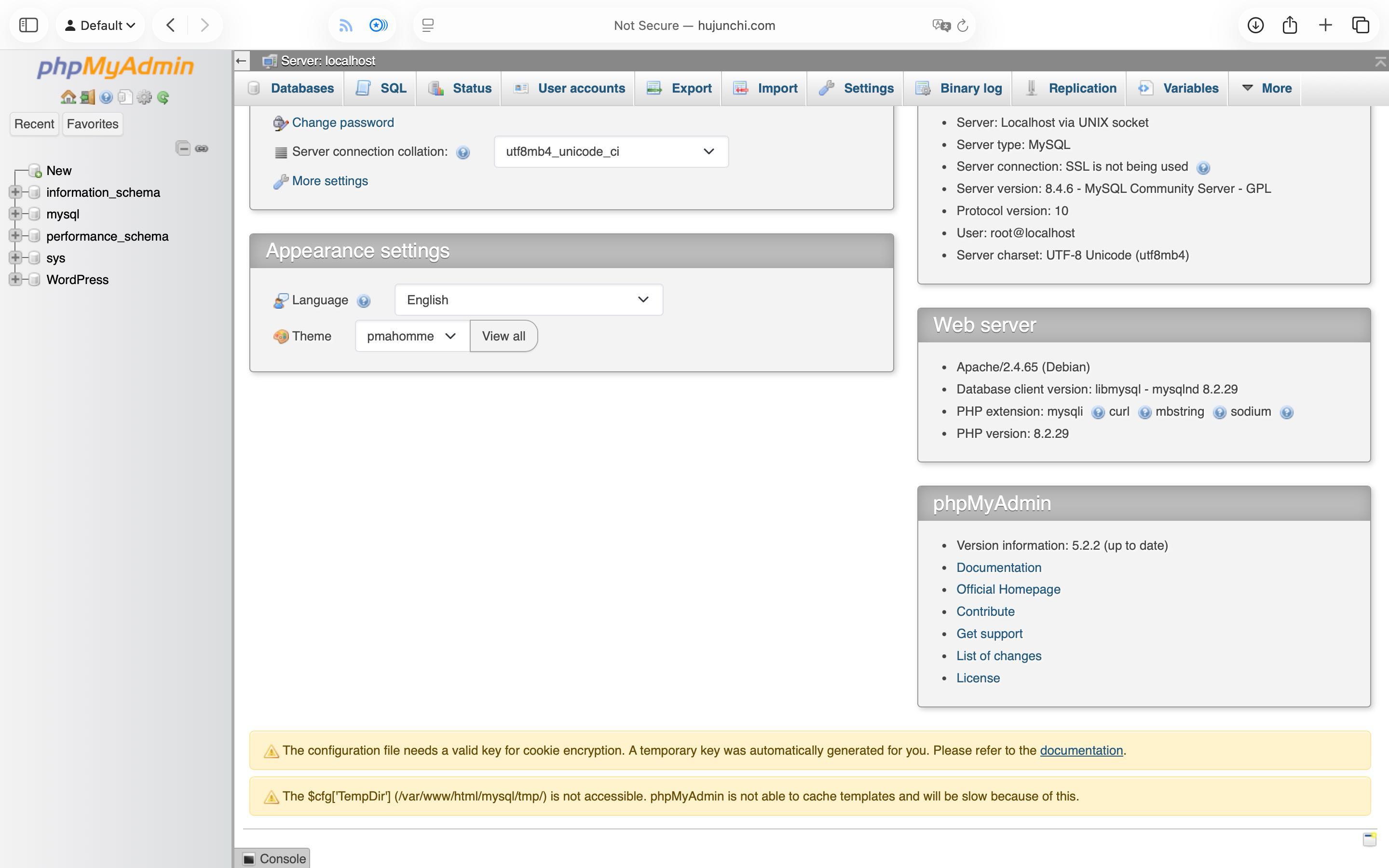 注意到页面下方的警示内容,提示未设置 cookie 加密词,可能存在安全问题,因此修改 config.inc.php 文件,找到 blowfish_secret,设置为任意 32 位字符串: